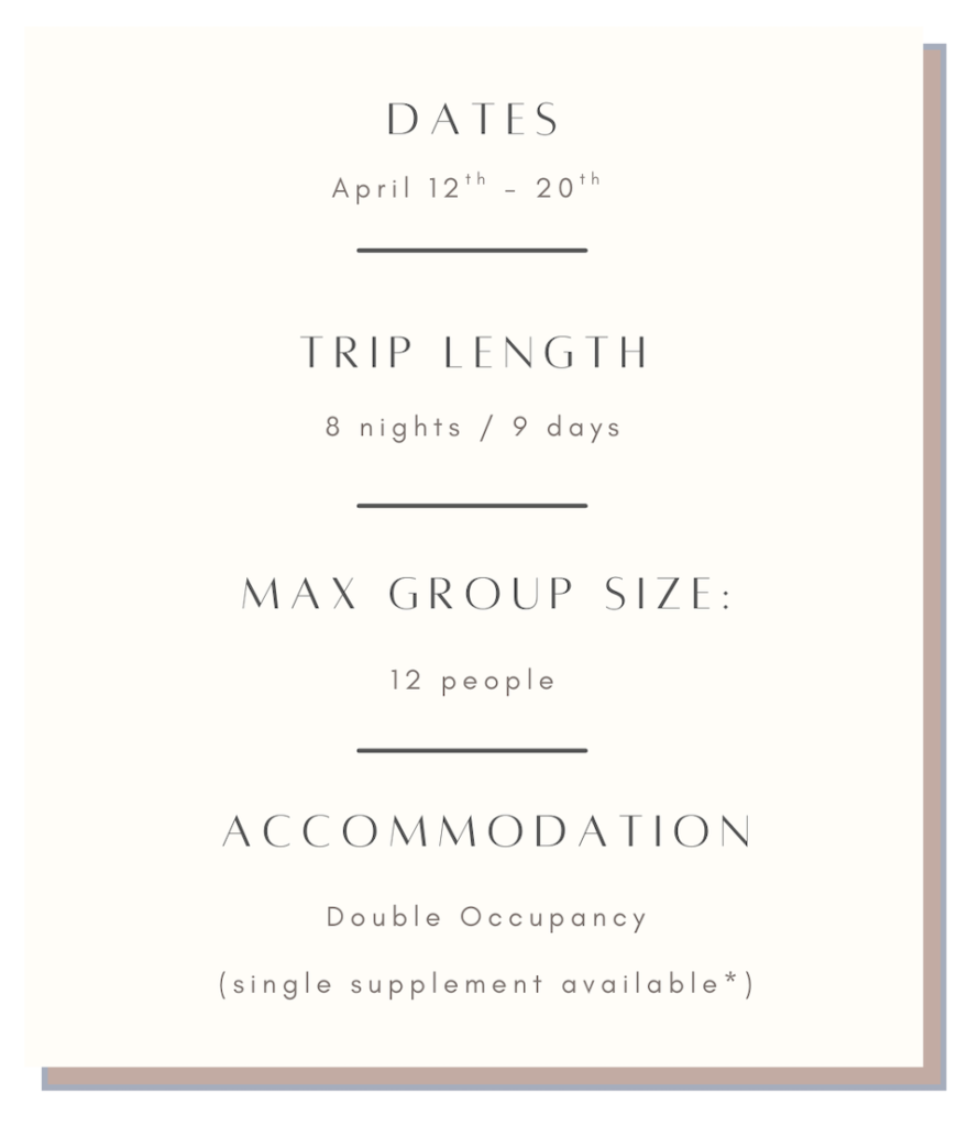 DISCLOSURE: The information on this page is indicative of tours, activities, dining, and accommodation. The itinerary is subject to change due to inclement weather or other factors outside of our control. We want to make sure that you have the best possible experience and will substitute anything that must be changed with something equally or even more amazing. We are organizing this itinerary to give you many activities and opportunities for leisure time. Note that our itinerary focuses on local experiences, including food, so meals might not have many Western options. For more information, visit our Terms and Conditions.