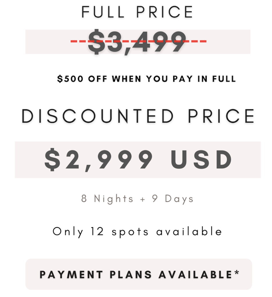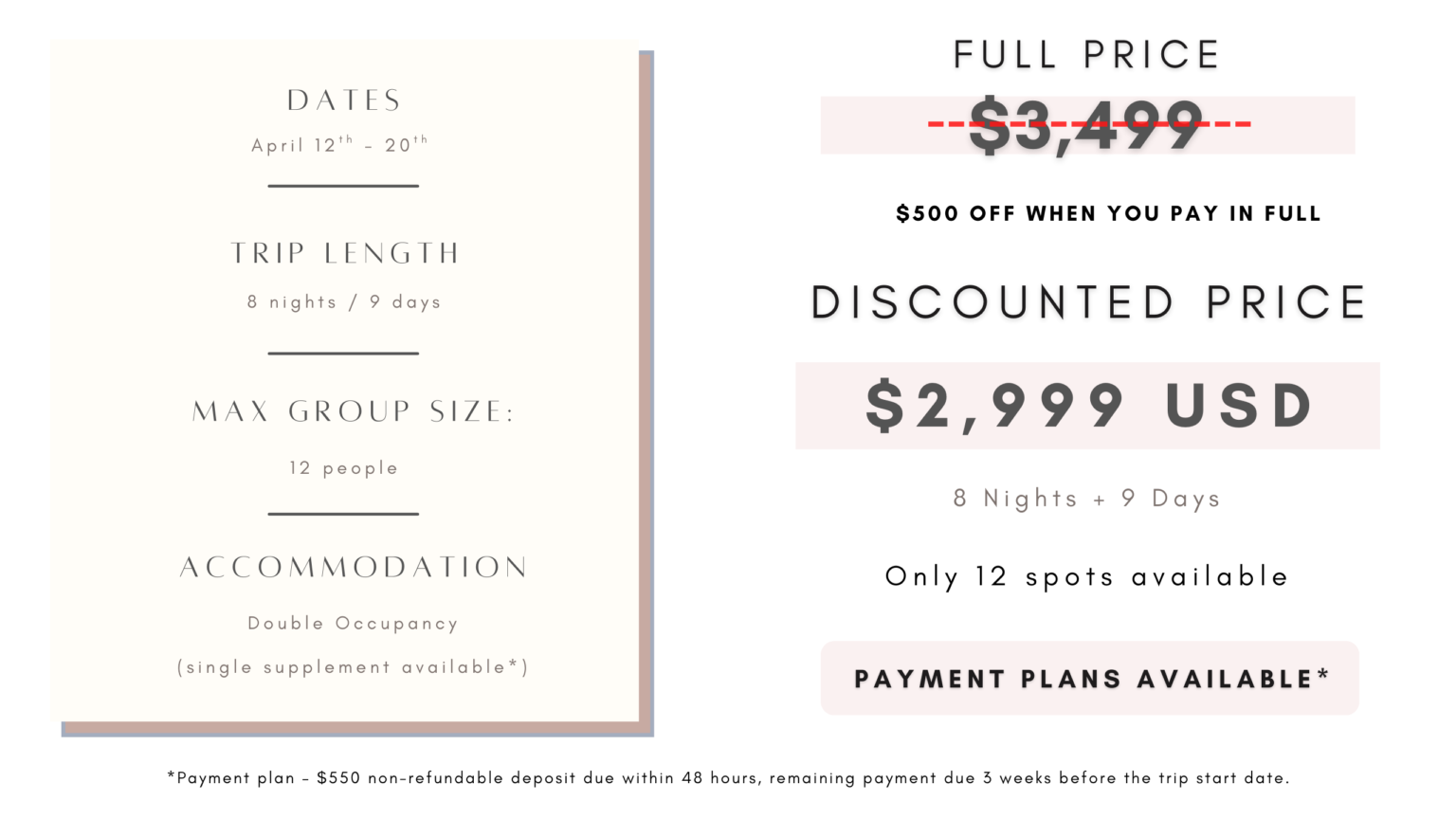 A $550 deposit is due with 48h hours to confirm your spot for the trip: $550 for double occupancy / $650 for single occupancy
